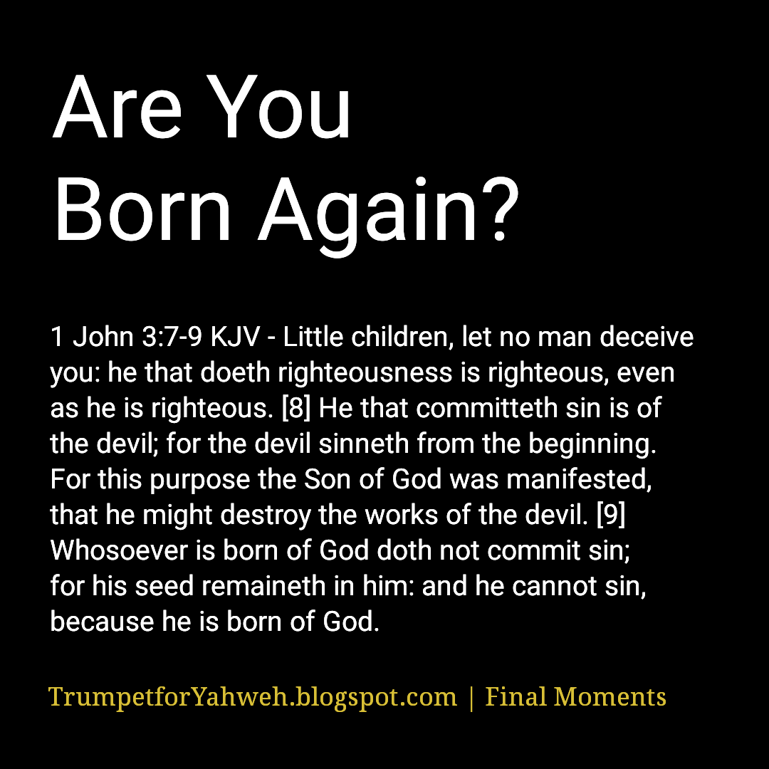 - John 3:3-6 KJV - Jesus answered and said unto him, Verily, verily, I say unto thee, Except a man be born again, he cannot see the kingdom of God. [4] Nicodemus saith unto him, How can a man be born when he is old? can he enter the second time into his mother's womb, and be born? [5] Jesus answered, Verily, verily, I say unto thee, Except a man be born of water and of the Spirit, he cannot enter into the kingdom of God. [6] That which is born of the flesh is flesh; and that which is born of the Spirit is spirit.
